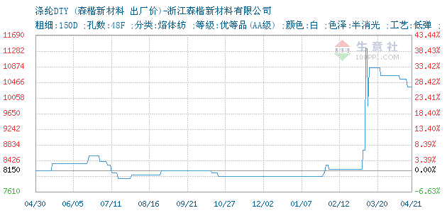 01月12日森楷新材料关于涤纶DTY的报价为9160元/吨。涤纶DTY的规格:粗细:150D ;孔数:48F ;分类:熔体纺 ;等级:优等品(AA级) ;颜色:白 ;色泽:半消光 ;工艺:低弹 ;。该报价有效期为3天。报价提供方:浙江森楷新材料有限公司。