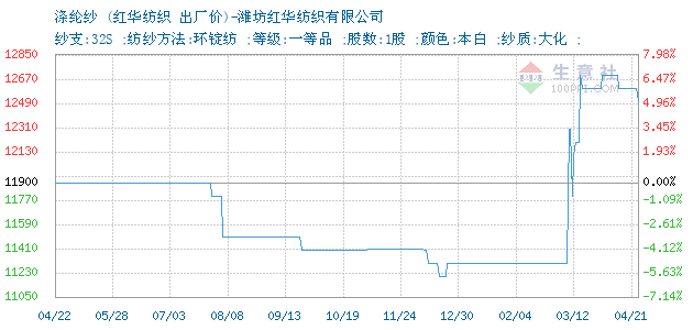01月13日潍坊红华纺织有限公司关于32S涤纶纱的报价为14000元/吨。32S涤纶纱的规格:纱支:32S ;纺纱方法:环锭纺 ;等级:一等品 ;股数:1股 ;颜色:本白 ;纱质:大化 ;。该报价有效期为3天。报价提供方:潍坊红华纺织有限公司。