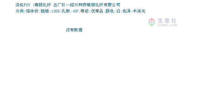01月13日瑞丽化纤关于涤纶POY的报价为7700元/吨。涤纶POY的规格:分类:熔体纺;粗细:150D;孔数:48F;等级:优等品;颜色:白;色泽:半消光。该报价有效期为3天。报价提供方:绍兴柯桥瑞丽化纤有限公司。
