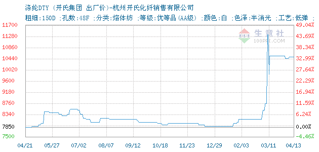 01月17日开氏关于涤纶DTY的报价为9450元/吨。涤纶DTY的规格:粗细:150D ;孔数:48F ;分类:熔体纺 ;等级:优等品(AA级) ;颜色:白 ;色泽:半消光 ;工艺:低弹 ;。该报价有效期为3天。报价提供方:杭州开氏化纤销售有限公司。