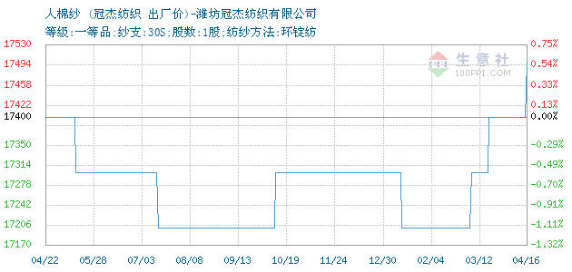 01月18日潍坊冠杰纺织有限公司关于人棉纱的报价为18400元/吨。人棉纱的规格:等级:一等品;纱支:30S;股数:1股;纺纱方法:环锭纺。该报价有效期为3天。报价提供方:潍坊冠杰纺织有限公司。
