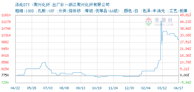 01月25日聚兴化纤关于涤纶DTY的报价为9100元/吨。涤纶DTY的规格:粗细:150D ;孔数:48F ;分类:熔体纺 ;等级:优等品(AA级) ;颜色:白 ;色泽:半消光 ;工艺:低弹 ;。该报价有效期为3天。报价提供方:浙江聚兴化纤有限公司。