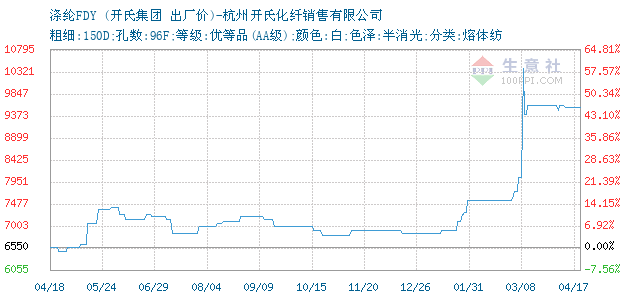 01月25日开氏集团关于涤纶FDY的报价为8000元/吨。涤纶FDY的规格:粗细:150D;孔数:96F;等级:优等品(AA级);颜色:白;色泽:半消光;分类:熔体纺。该报价有效期为3天。报价提供方:杭州开氏化纤销售有限公司。