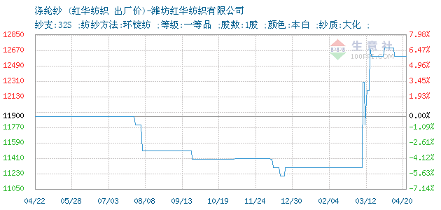 01月27日潍坊红华纺织有限公司关于32S涤纶纱的报价为14000元/吨。32S涤纶纱的规格:纱支:32S ;纺纱方法:环锭纺 ;等级:一等品 ;股数:1股 ;颜色:本白 ;纱质:大化 ;。该报价有效期为3天。报价提供方:潍坊红华纺织有限公司。