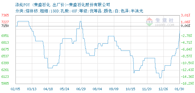 10月28日荣盛石化关于涤纶POY的报价为7700元/吨。涤纶POY的规格:分类:熔体纺;粗细:150D;孔数:48F;等级:优等品;颜色:白;色泽:半消光。该报价有效期为3天。报价提供方:荣盛石化股份有限公司。
