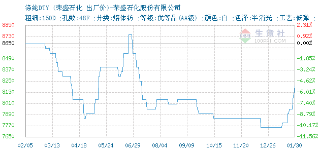 10月28日荣盛石化关于涤纶DTY的报价为8800元/吨。涤纶DTY的规格:粗细:150D ;孔数:48F ;分类:熔体纺 ;等级:优等品(AA级) ;颜色:白 ;色泽:半消光 ;工艺:低弹 ;。该报价有效期为3天。报价提供方:荣盛石化股份有限公司。
