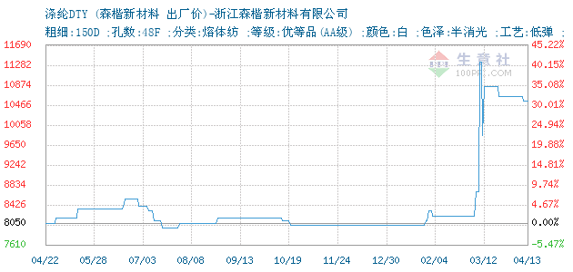 02月14日森楷新材料关于涤纶DTY的报价为9610元/吨。涤纶DTY的规格:粗细:150D ;孔数:48F ;分类:熔体纺 ;等级:优等品(AA级) ;颜色:白 ;色泽:半消光 ;工艺:低弹 ;。该报价有效期为3天。报价提供方:浙江森楷新材料有限公司。