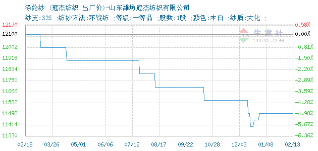 02月17日潍坊冠杰纺织有限公司关于32S涤纶纱的报价为14500元/吨。32S涤纶纱的规格:纱支:32S ;纺纱方法:环锭纺 ;等级:一等品 ;股数:1股 ;颜色:本白 ;纱质:大化 ;。该报价有效期为3天。报价提供方:山东潍坊冠杰纺织有限公司。