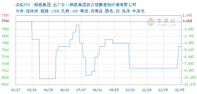02月18日桐昆集团股份有限公司关于涤纶POY的报价为8460元/吨。涤纶POY的规格:分类:熔体纺;粗细:150D;孔数:48F;等级:优等品;颜色:白;色泽:半消光。该报价有效期为3天。报价提供方:桐昆集团浙江恒腾差别纤维有限公司。