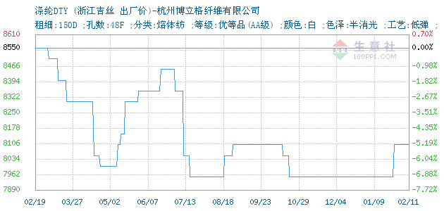 03月14日博立格关于涤纶DTY的报价为10010元/吨。涤纶DTY的规格:粗细:150D ;孔数:48F ;分类:熔体纺 ;等级:优等品(AA级) ;颜色:白 ;色泽:半消光 ;工艺:低弹 ;。该报价有效期为3天。报价提供方:杭州博立格纤维有限公司。