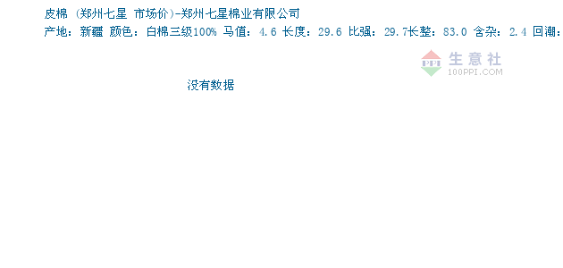 03月15日郑州七星关于皮棉的报价为22950元/吨。皮棉的规格:产地:新疆 颜色:白棉三级100% 马值:4.6 长度:29.6 比强:29.7长整:83.0 含杂:2.4 回潮:6.7。该报价有效期为3天。报价提供方:郑州七星棉业有限公司。