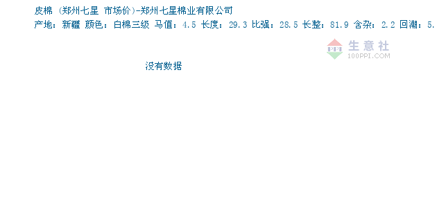 03月15日郑州七星关于皮棉的报价为23150元/吨。皮棉的规格:产地:新疆 颜色:白棉三级 马值:4.5 长度:29.3 比强:28.5 长整:81.9 含杂:2.2 回潮:5.6。该报价有效期为3天。报价提供方:郑州七星棉业有限公司。