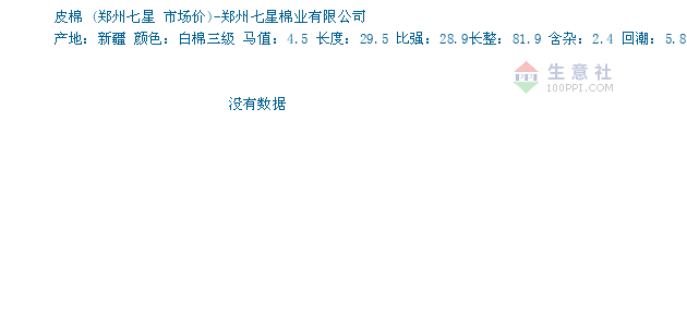 03月15日郑州七星关于皮棉的报价为23150元/吨。皮棉的规格:产地:新疆 颜色:白棉三级 马值:4.5 长度:29.5 比强:28.9长整:81.9 含杂:2.4 回潮:5.8。该报价有效期为3天。报价提供方:郑州七星棉业有限公司。