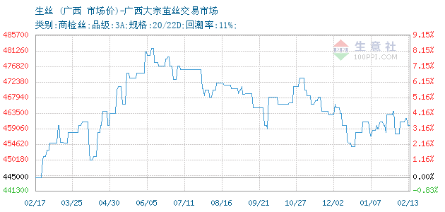 03月16日广西大宗茧丝交易市场关于生丝的报价为446825元/吨。生丝的规格:类别:商检丝;品级:3A;规格:20/22D;回潮率:11%;。该报价有效期为3天。报价提供方:广西大宗茧丝交易市场。