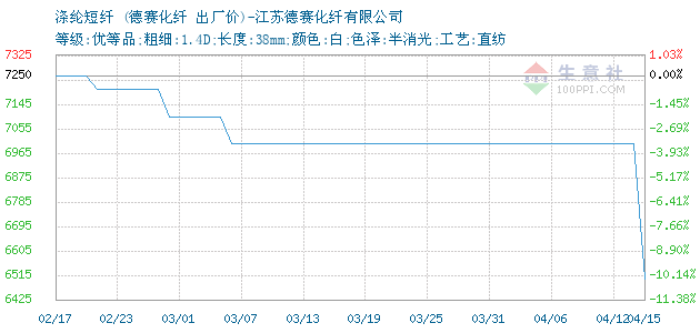 03月30日江苏德赛化纤有限公司关于涤纶短纤的报价为7950元/吨。涤纶短纤的规格:等级:优等品;粗细:1.4D;长度:38mm;颜色:白;色泽:半消光;工艺:直纺。该报价有效期为3天。报价提供方:江苏德赛化纤有限公司。