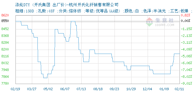 03月07日开氏关于涤纶DTY的报价为10100元/吨。涤纶DTY的规格:粗细:150D ;孔数:48F ;分类:熔体纺 ;等级:优等品(AA级) ;颜色:白 ;色泽:半消光 ;工艺:低弹 ;。该报价有效期为3天。报价提供方:杭州开氏化纤销售有限公司。