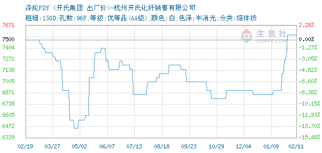 03月07日开氏集团关于涤纶FDY的报价为8800元/吨。涤纶FDY的规格:粗细:150D;孔数:96F;等级:优等品(AA级);颜色:白;色泽:半消光;分类:熔体纺。该报价有效期为3天。报价提供方:杭州开氏化纤销售有限公司。