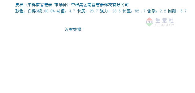 04月01日中棉南宫宏泰关于皮棉的报价为22955元/吨。皮棉的规格:颜色:白棉3级100.0% 马值:4.7 长度:28.7 强力:28.5 长整:82 .7 含杂:2.2 回潮:5.7。该报价有效期为3天。报价提供方:中棉集团南宫宏泰棉花有限公司。
