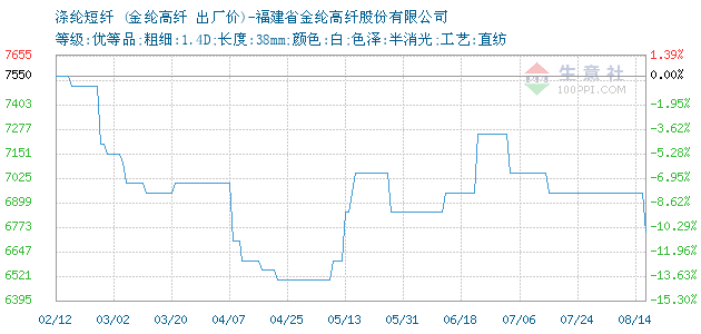 04月29日福建省金纶高纤股份有限公司关于涤纶短纤的报价为8100元/吨。涤纶短纤的规格:等级:优等品;粗细:1.4D;长度:38mm;颜色:白;色泽:半消光;工艺:直纺。该报价有效期为3天。报价提供方:福建省金纶高纤股份有限公司。