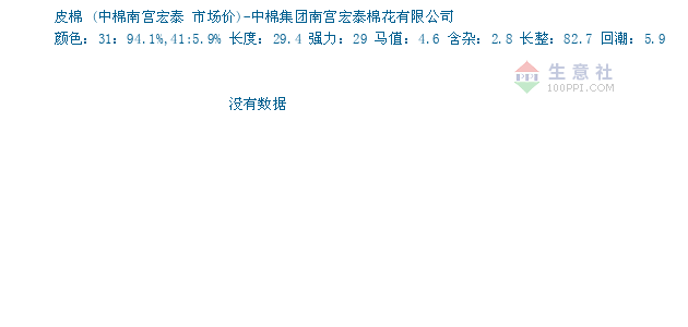 05月12日中棉南宫宏泰关于皮棉的报价为22300元/吨。皮棉的规格:颜色:31:94.1%,41:5.9% 长度:29.4 强力:29 马值:4.6 含杂:2.8 长整:82.7 回潮:5.9。该报价有效期为3天。报价提供方:中棉集团南宫宏泰棉花有限公司。
