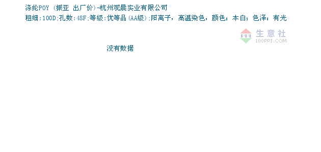 05月06日振亚关于涤纶POY的报价为8960元/吨。涤纶POY的规格:粗细:100D;孔数:48F;等级:优等品(AA级);阳离子,高温染色,颜色:本白;色泽:有光。该报价有效期为3天。报价提供方:杭州观晨实业有限公司。