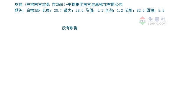 05月09日中棉南宫宏泰关于皮棉的报价为23650元/吨。皮棉的规格:颜色:白棉3级 长度:28.7 强力:28.5 马值:5.1 含杂:1.2 长整:82.5 回潮:5.5。该报价有效期为3天。报价提供方:中棉集团南宫宏泰棉花有限公司。