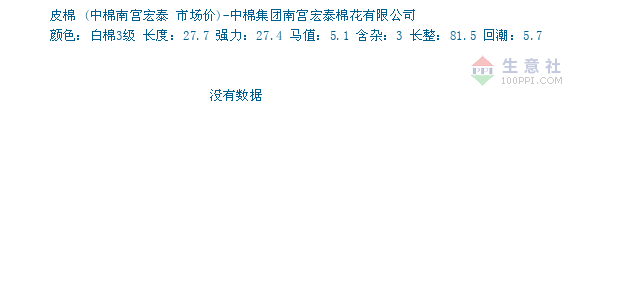 05月09日中棉南宫宏泰关于皮棉的报价为23350元/吨。皮棉的规格:颜色:白棉3级 长度:27.7 强力:27.4 马值:5.1 含杂:3 长整:81.5 回潮:5.7。该报价有效期为3天。报价提供方:中棉集团南宫宏泰棉花有限公司。