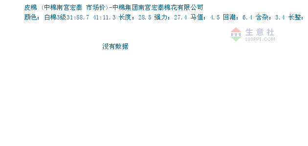 06月10日中棉南宫宏泰关于皮棉的报价为20650元/吨。皮棉的规格:颜色:白棉3级31:88.7 41:11.3 长度:28.5 强力:27.4 马值:4.5 回潮:6.4 含杂:3.4 长整:82.4。该报价有效期为3天。报价提供方:中棉集团南宫宏泰棉花有限公司。