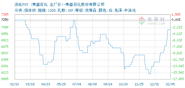 06月23日荣盛石化关于涤纶POY的报价为8500元/吨。涤纶POY的规格:分类:熔体纺;粗细:150D;孔数:48F;等级:优等品;颜色:白;色泽:半消光。该报价有效期为3天。报价提供方:荣盛石化股份有限公司。