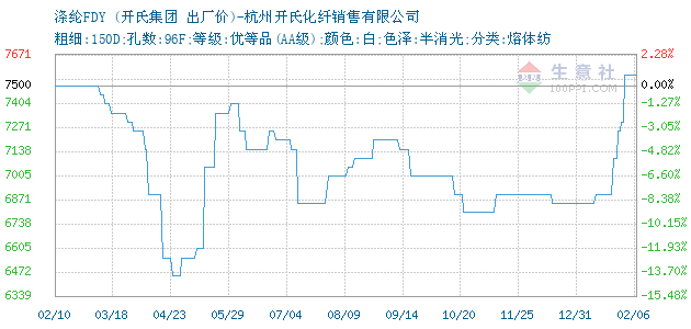 06月23日开氏集团关于涤纶FDY的报价为9100元/吨。涤纶FDY的规格:粗细:150D;孔数:96F;等级:优等品(AA级);颜色:白;色泽:半消光;分类:熔体纺。该报价有效期为3天。报价提供方:杭州开氏化纤销售有限公司。