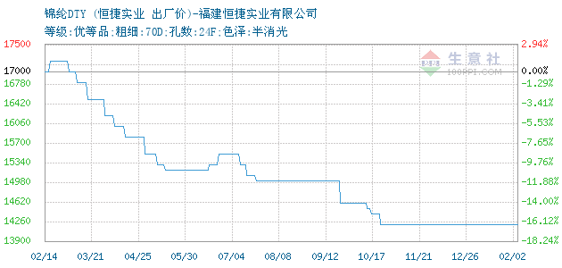 07月12日福建恒捷实业有限公司关于锦纶DTY的报价为20100元/吨。锦纶DTY的规格:等级:优等品;粗细:70D;孔数:24F;色泽:半消光。该报价有效期为3天。报价提供方:福建恒捷实业有限公司。