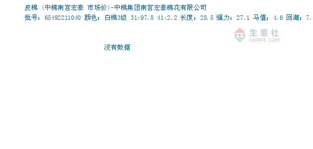 07月26日中棉南宫宏泰关于皮棉的报价为16000元/吨。皮棉的规格:批号:65492211040 颜色:白棉3级 31:97.8 41:2.2 长度:28.5 强力:27.1 马值:4.6 回潮:7.4 含杂:3.4 长整:82.3。该报价有效期为3天。报价提供方:中棉集团南宫宏泰棉花有限公司。