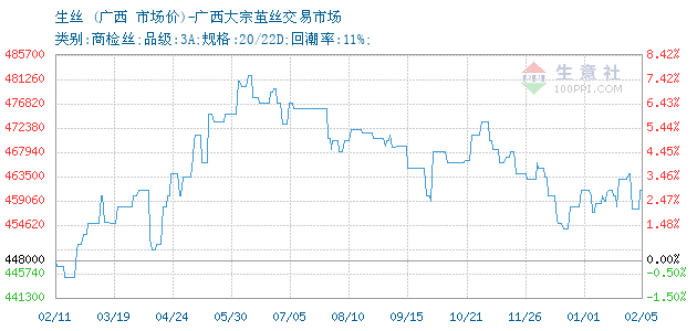 08月01日广西大宗茧丝交易市场关于生丝的报价为438375元/吨。生丝的规格:类别:商检丝;品级:3A;规格:20/22D;回潮率:11%;。该报价有效期为3天。报价提供方:广西大宗茧丝交易市场。