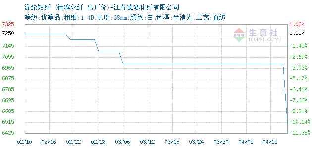 08月17日江苏德赛化纤有限公司关于涤纶短纤的报价为7750元/吨。涤纶短纤的规格:等级:优等品;粗细:1.4D;长度:38mm;颜色:白;色泽:半消光;工艺:直纺。该报价有效期为3天。报价提供方:江苏德赛化纤有限公司。