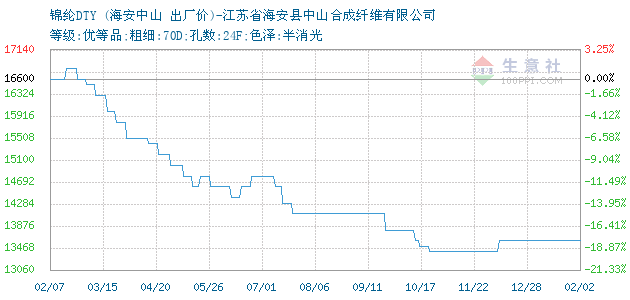 08月04日海安中山关于锦纶DTY的报价为19000元/吨。锦纶DTY的规格:等级:优等品;粗细:70D;孔数:24F;色泽:半消光。该报价有效期为3天。报价提供方:江苏省海安县中山合成纤维有限公司。