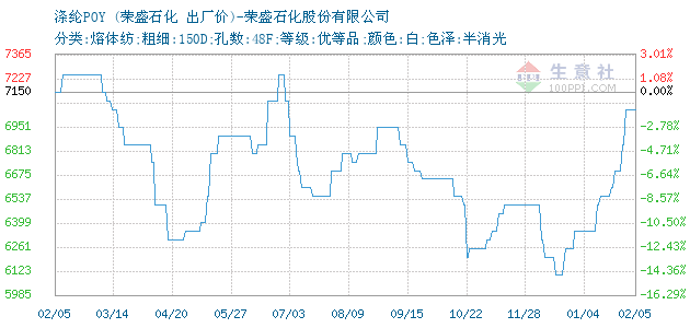 09月07日荣盛石化关于涤纶POY的报价为7950元/吨。涤纶POY的规格:分类:熔体纺;粗细:150D;孔数:48F;等级:优等品;颜色:白;色泽:半消光。该报价有效期为3天。报价提供方:荣盛石化股份有限公司。